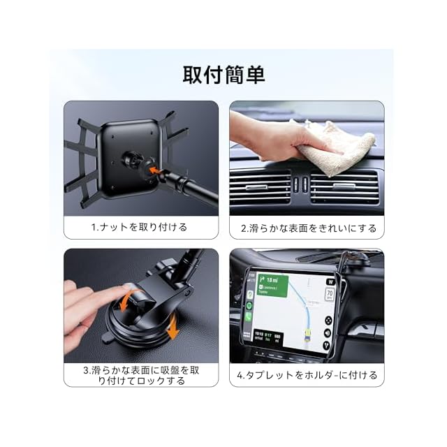 【取り付けやすい】このipad車載吸盤ホルダーは、フロントガラスや滑らかな面に、他の工具を使わずに簡単に固定できます。吸盤の底部の保護シートをはがして、車のフラットブラケットを取り付ける必要がある場所に合わせてからロックレバーを押すと、吸盤がダッシュボードにしっかりと固定される強力な吸引力を得ることができます。粘着力が弱まったら、水で洗って放置して乾燥させるだけで粘着力が回復することができます。