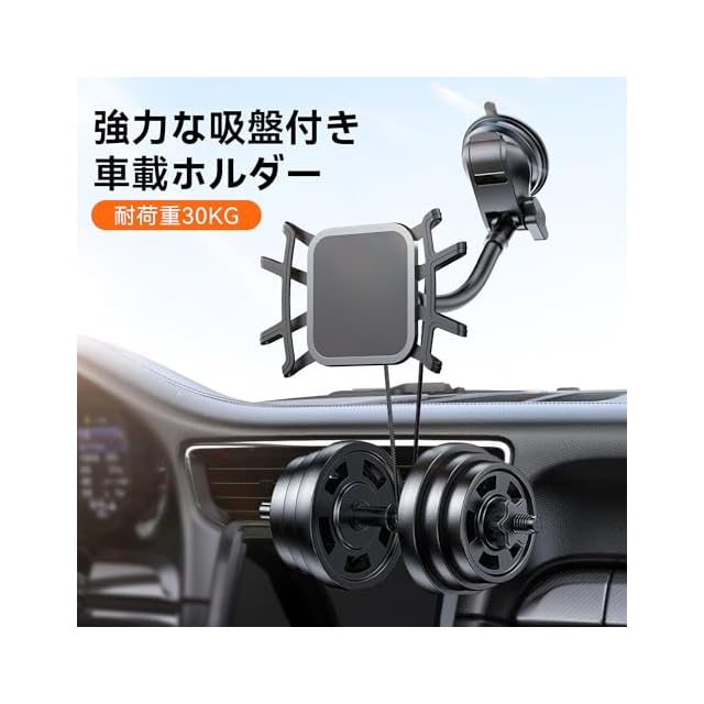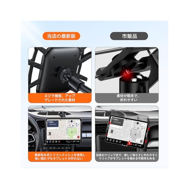 【柔軟なグースネックタブレットホルダー】この車載iPadホルダーは全面的にアップグレードされています。グースネックの内面は金属製で、任意に曲がることができ、変形しにくく、割れないなどのメリットがあります。接続棒はゴムカバーを採用して全体の質感を高め、老化や錆を防止することができます。両端はネジ穴を採用して突き合わせ、安定して動かなく、堅固な吸盤はどんな滑らかな平面でも吸着することが可能です。また、車載ホルダーは柔軟なシリコンメッシュでタブレットを固定するようにアップグレードされており、従来のクリップ式車載ホルダーと異なり、iPadを傷つけません。
