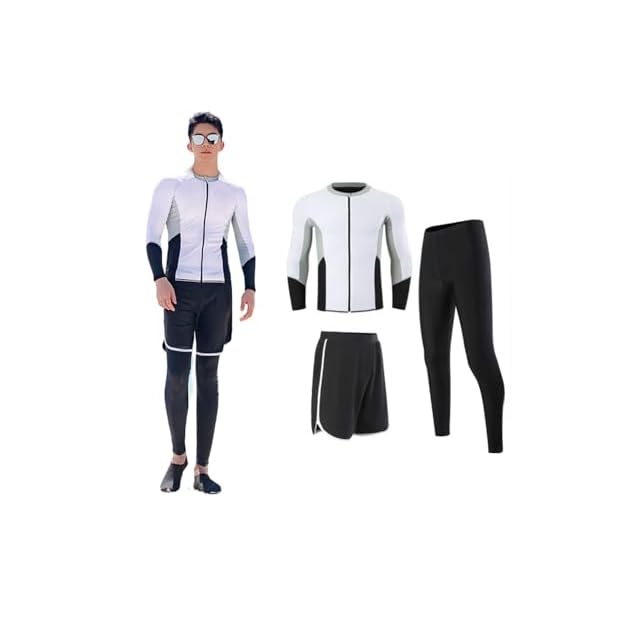 【メンズ3点セット】ラッシュガード+サーフパンツ+レギンス。ポリウレタン。ソフトな肌触りの冷感素材を使用、良い着心地と抜群の耐久性、ストレッチが効いているので動きやすいです。【UV対策】UVカット生地を使用しているので、着るだけで首元から足首までしっかり日差しからガード。岩場等でのケガから身を守る為にも着いているだけで安心感UP!サーフパンツとレギンスセット、レギンス付き足首まであるので、虫刺されやクラゲ対策、擦り傷などの外傷対策にも 【水陸両用フィットネスウェア】ポリエステルポリウレタン伸縮性と通気性に優れており丈夫で破れにくい素材を採用。軽量なのでとても動きやすく、最適の機能性、吸汗速乾通気のドライ繊維、激しい運動の後もさらっとした着心地!運動に最適です!ジスポーツやフィットネスに、スイミング、サーフィン、ジム、サイクリング、ダイビングと幅広いジャンルで使える便利なスポーツアイテムです。