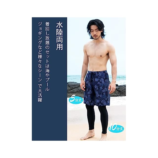 [NARANNBU] ラッシュガード メンズ 水着 長袖 上下3点セット パーカ+レギンス+海水パンツ 冷感・吸汗速乾・水陸両用 UVカット 大きいサイズ #l5ネイビーリーフ&ブラック M | Trend Design BASE店