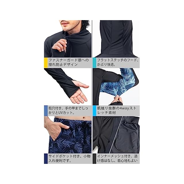 2023年5月新品発売メンズ水着ラッシュガード[フード付き] 豪華3点セットを紹介させていただきます。 素材構成: 82%ナイロン、18% ポリウレタン 3点セット:ラッシュガード「フード付」+サーフパンツ+10分丈レギンス ─ Detail Check Points ─ #1.ラッシュガード「フード付き」、フードを被れば、首周りと頭も紫外線をしっかりガード; #2.ファスナーガード付き、顔や首元への擦れを防止; #3・指穴付き、手の甲まで日焼けを防止; #4・ゴムウェストは紐付きサイズを調整できる; #5・海水パンツは両サイドに側ポケット付き; #6・レギンスにはメッシュインナー付き、安全安心; *伸縮性に優れた生地フィットネスに最適な水着セットです。耐衝撃性の高いポリカーボネイト採用、曇止め加工、UVカット機能を持っている。 *綺麗なラインが出るのですっきり男らしい印象に~ 昼間の暑い日ざしからはもちろん、夕方の浜風での 体の冷えもコレ一枚でバッチリ対策です [UV対策]安心のUPF50+(肌に有害な紫外線を99.8%以上カット)生地使用~様々なシーンで使える「着るだけ」UV対策ウェア。*日焼け対策もこれでバッチリ~スポーティーなオシャレさ抜群ラッシュガード☆ 使いやすいブラックだから海やジムなど、 様々なシーンに大活躍。 *機能性だけでなくデザインも考え抜かれた商品です 海やプールに着たまま出かけて着たまま帰れるオシャレなデザインです。 サイズ レンジ: S:身長:155-165CM,体重:50-60KG; M:身長:165-175CM,体重:60-70KG; L:身長:172-180CM,体重:70-80KG; XL:身長:178-185CM,体重:80-90KG; 2XL:身長:182-195CM,体重:90-105KG;