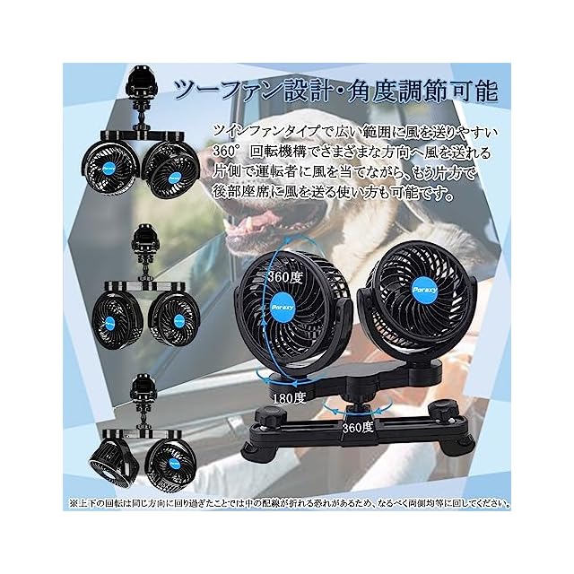 商品名:「2025年最新アップグレード」PORAXY 車載扇風機 車 扇風機 4インチ 車載ファン 電動ファン低騒音 無段階風量調節可能 角度調整可能 ツーファン付き リアフロント両用 汎用タイプ 夏対策 DC12V 車用 後部座席 扇風機 日本語マニュアル付 2025年1月25日よりモーターアップデート