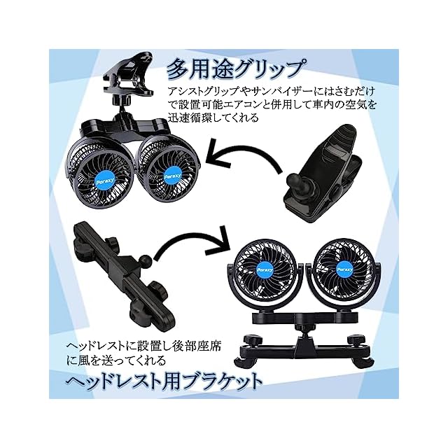 左右180°上下360°角度調節可能:ファンはそれぞれ角度調節できるので、様々な方向へ風を送れます。片側で運転者に風を当てながら、もう片方で後部座席にかぜを送る使い方も可能です。また、多用途グリップ付属しておりますので、ご都合によってアシストグリップやサンバイザーなどに設置していただけます。設置簡単で便利な夏対策品です。