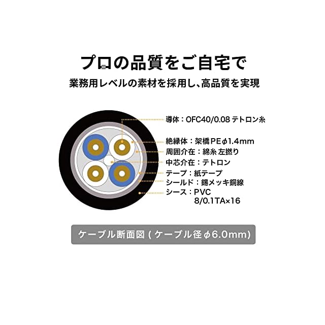 業務用レベルの素材を採用し高品質を実現。プロ・業務用途で標準となる4 芯構造に加え、導体には無酸 素銅(OFC*)を、シールド線に は密度の高い編組構造、外来 ノイズに強い設計を採用。ご自 宅でもスタジオ同等の環境を 整えることができます。*OFC:Oxygen-Free Copper (高純度無酸素銅)99.99%純度の 無酸素銅