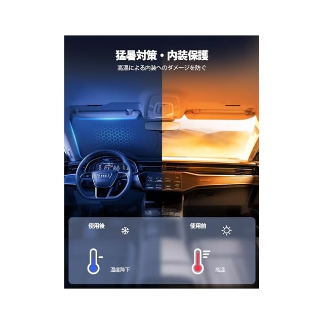 【猛暑対策・内装保護】内装劣化防止、ダメージや経年劣化を防ぎます。駐車時の大事な車を太陽光による損傷やハンドル焼け、ダッシュボードなどの樹脂部分の日焼けからしっかりご愛車を守ります。駐車の度に気持ちをより涼しくしてくれます。