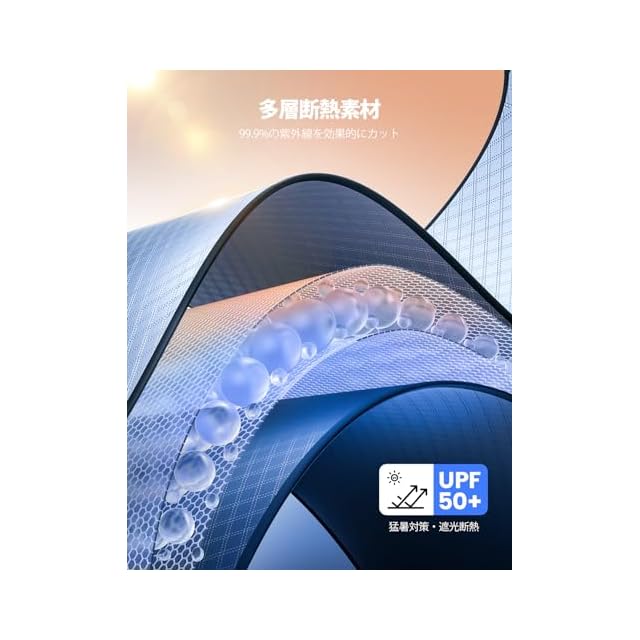 【高品質6層構造・遮光断熱】夏には、紫外線を防ぎ、車内の温度を下げることを目指します。フロントサンシェードにより、紫外線に対するバリアを作ります。約98%以上の紫外線を効果的に遮断しますので、外気温が上昇しても、駐車中の車内を涼しく保ち、ひどい暑さを防げます。蒸し暑い車の環境に悩まされることはなくなります。