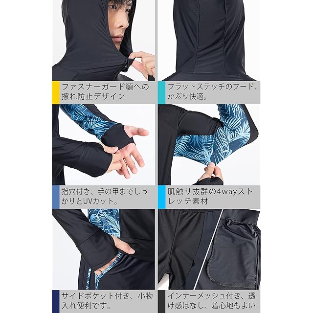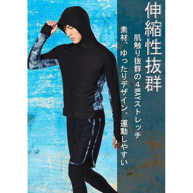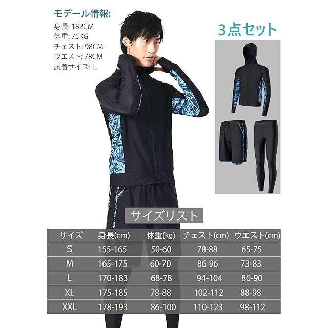2022年7月発売メンズ水着ラッシュガード[フード付き] 豪華3点セットを紹介させていただきます。 素材構成: 82%ナイロン、18% ポリウレタン 3点セット:ラッシュガード「フード付」+サーフパンツ+10分丈レギンス ─ Detail Check Points ─ #1.ラッシュガード「フード付き」、フードを被れば、首周りと頭も紫外線をしっかりガード; #2.ファスナーガード付き、顔や首元への擦れを防止; #3・指穴付き、手の甲まで日焼けを防止; #4・ゴムウェストは紐付きサイズを調整できる; #5・海水パンツは両サイドに側ポケット付き; #6・レギンスにはメッシュインナー付き、安全安心; *伸縮性に優れた生地フィットネスに最適な水着セットです。耐衝撃性の高いポリカーボネイト採用、曇止め加工、UVカット機能を持っている。 *綺麗なラインが出るのですっきり男らしい印象に~ 昼間の暑い日ざしからはもちろん、夕方の浜風での 体の冷えもコレ一枚でバッチリ対策です [UV対策]安心のUPF50+(肌に有害な紫外線を99.8%以上カット)生地使用~様々なシーンで使える「着るだけ」UV対策ウェア。*日焼け対策もこれでバッチリ~スポーティーなオシャレさ抜群ラッシュガード☆ 使いやすいブラックだから海やジムなど、 様々なシーンに大活躍。 *機能性だけでなくデザインも考え抜かれた商品です 海やプールに着たまま出かけて着たまま帰れるオシャレなデザインです。 サイズ レンジ: S:身長:155-165CM,体重:50-60KG; M:身長:165-175CM,体重:60-70KG; L:身長:172-180CM,体重:70-80KG; XL:身長:178-185CM,体重:80-90KG; 2XL:身長:182-195CM,体重:90-105KG;