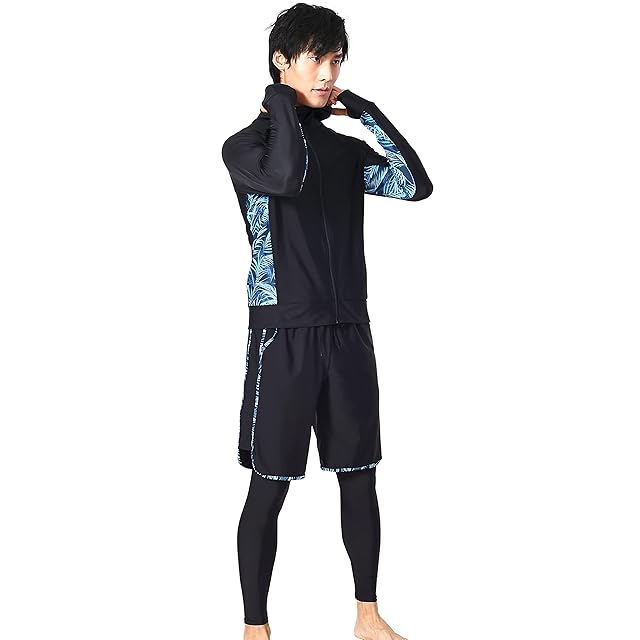 [NARANNBU] 水着 メンズ ラッシュガード 長袖 上下3点セット パーカ+レギンス+海水パンツ 冷感・吸汗速乾・水陸両用 UVカット 大きいサイズ #n1ブルーリーフ&ブラック XL | Trend Design BASE店