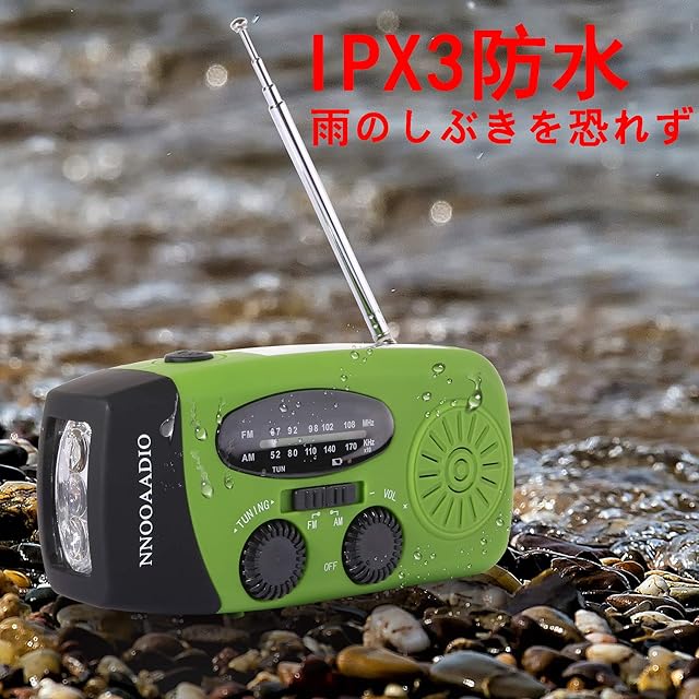 【照明とSOSと防水】このソーラーラジオは3つのLEDライトを共有しています。懐中電灯のスイッチを短く押すと、一段は弱い光、二段は強い光です。懐中電灯のスイッチを長押しします、SOS警報が鳴り,警報ハイビームがモス信号で点滅します。停電、戸外で家族と明るさをもたらすことができますと非常備蓄です。IPX 3-防水、この非常用照明器具は生活防水を満たしています。ラジオの飛散や小雨の被害から守ることができます。ただし、水に浸したり、雨に濡れたりしてはいけませんので、ご注意ください。