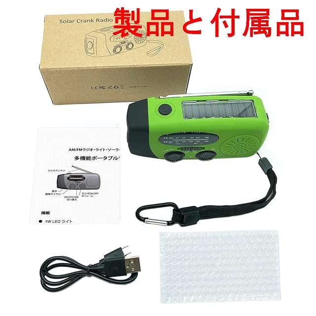 商品名:ソーラーラジオライト 懐中電灯を内蔵した非常用照明器具ラジオ 手回し、ソーラー、USB、リチウムバッテリーの4つの電源モードをサポートし iPhone、Android、タブレット全スマホ充電。大容量2000mAh。SOS警報 防水防災グッズ、地震、津波、台風、停電などの緊急事態に利用できます。AM/FM対応で、充電ケーブル、携帯用バンドです、日本語の説明書を配置し