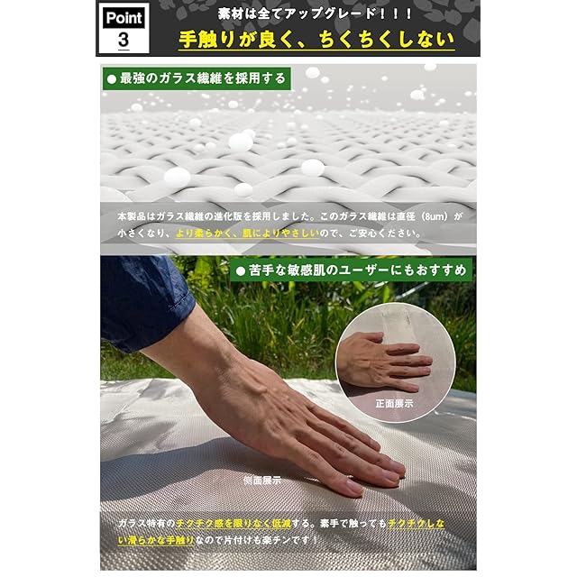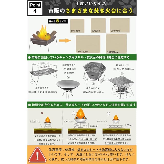 【完璧なエッジング】縫い目はしっかりしているので、プロの裾上げにより、製品はより美しく見えます。普通の洒落た敷物として違和感ありません。高級ガラス繊維布なので、見た目は色が薄く見えます。普通のガラス繊維と比較して、表面がより滑らかに、柔らかくなり、素手で触るとちくちくする発生を効果的に回避します。注意事項:使用後、焚き火台シートを洗濯機に入れない方がいいです。そして、丸洗いしない方がいいと思います。はたいた後に、絞った雑巾で何回か拭けば汚れは十分に落ちます。