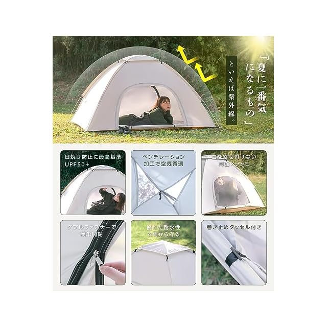 【UVカット&優れた耐水性】テントシート素材はポリエスレルのオックスフォード織。柔らかい手触りと強度があります。オックスフォード織は気孔が多く、厚地ですが通気性に富んでいて夏場には最適です。さらにシート裏面にはUVシルバーコーティングが施され、遮熱性、遮光性に優れ、UVカットは世界基準UPF50+の最大99%カット値を認証されています。炎炎夏の日差しからしっかりと身を守り、紫外線による肌のダメージを軽減します。アウトドア活動をより安心して楽しむことができます。また、耐水圧2,000㎜の高い防水性があり、荒天に配慮された安心なテントです。
