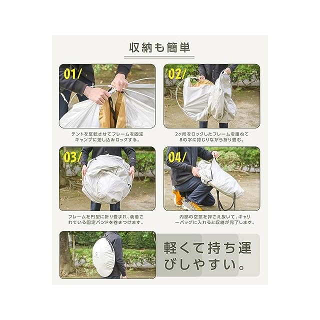 【持ち運びやすい&製品仕様】 製品名:ホップアップテント カラー:グリーン 材質:ポリエステル(オックスフォード織)、グラスファイバー(フレーム) サイズ:組立時 約W200×H120×D150㎝ 。収納時は円形に折りたたむ収納式。約Ø60*t2.5㎝に収納。重量は約1.4kgの軽量タイプ。持ち運びやすいキャリーバッグが付いています。車に積み込みやすくトランクの荷物が多い時でも安心です。付属品:収納キャリーバッグ(ポリエステル製)