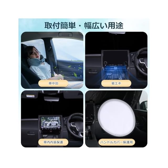 3.【多機能】:アルミ遮熱シートの眩しい光線を抑えることができます。他人に迷惑を掛けないし、プライバシーも保護できます。また、夏の日は熱線を遮断し、車内温度を抑えて、冬の日は車内の熱を外から逃がさない為、暖房効果があります。【ストラップ&収納袋付き】:本製品はストラップを設計し、収納する場合、ストラップで収納できます。また、収納袋も改良され、ハンドルカバーに置く可能です。