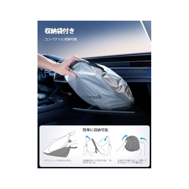 【簡単装着・収納可能】構造簡単で、吸盤を使わず、誰でも簡単に取り付ける可能です。本体を広げて下部をフロントガラスに押し当て、サンバイザーを下げて固定するだけで装着完成。また、収納袋があります。折り畳みでコンパクトに収納可能です。場所を取らない。