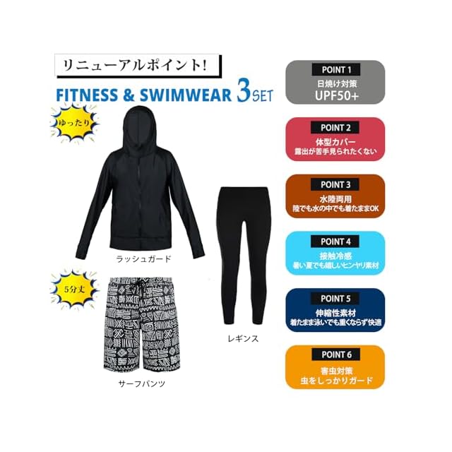 【セット内容】ラッシュガード、レギンス、サーフパンツ。