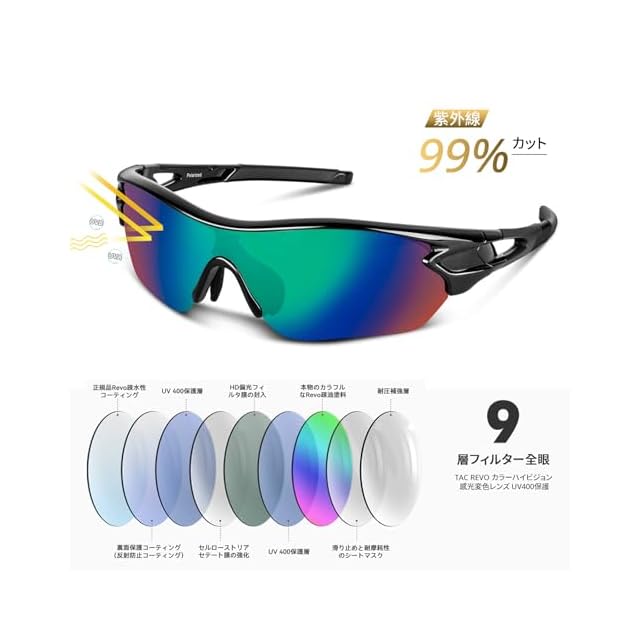 高品質のREVOカラーハイビジョン偏光レンズ:すべての偏光レンズは高品質破砕防止TAC材料で作られており、UV 400レンズ保護コーティング、有害なUVAとUVB 99.9%をブロックし、本物の色を復元し、REVO偏光レンズを使用して元の色を維持し、効果的に視覚の透明度とコントラストを改善し、より簡単に反射や散乱光を排除します。偏光サングラスは風景をよりクリアで柔らかくし、目の負担を減らします