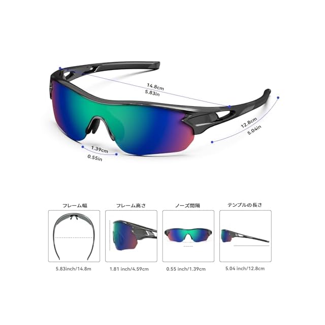 完璧なフィット感:BEACOOLスポーツサングラスは完璧なフィット感を提供するように設計されています。レンズ幅70 mm(2.76 inches)、ノーズブリッジ14mm(0.55inches)、フレーム長148 mm(5.83 inches)で、男女ともに快適な掛け心地を確保しながら、最適なカバー力を提供します。また、フレームとレンズのカラーコンビネーションが豊富です