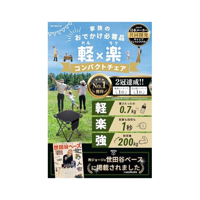 【超コンパクト使用シーン無限大】イス脚部の特殊ヒンジにより、使用後はコンパクトに折畳が可能です。また、専用のオックスフォード生地の収納袋にしまうことで、どこへでもすぐに持ち運びが可能です。キャンプ・BBQ・釣り・花火大会・テーマパーク待ち時間・大阪万博・ピクニック・花見・子供の試合観戦など様々なシーンでご使用いただけ、車に一台置いておけばどこでも安心なアウトドアアイテムです。