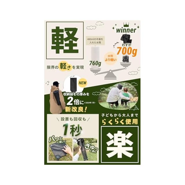 【重さたったの0.7kg!誰でもラクラク使用!】脚部に軽量カーボンスチールを使用し、クロス構造にすることで、限界の軽さを実現しつつ、十分な強度を確保しました。500ml水筒とほぼ同じ重さなので、徒歩での移動時も楽に携帯が可能です。使用する際は椅子を収納袋から取り出し、サッと開くだけ。使用後は折り畳みしまうだけで誰でも楽にご使用いただけます。