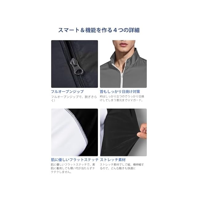 【着脱しやすい】メンズ 用ラッシュガードは脱ぎ着がカンタンな前開きフルジップタイプで、しっかり衿が立つのでうっかり日焼けしてしまう首元までUVガード。タウンでもビーチでも邪魔にならないので便利です。