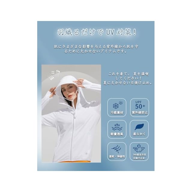 【日焼け対策はバッチリ】羽織るだけでUV対策!お肌に有害な紫外線を98%以上カット!最高レベルの紫外線防止効果UPF50+は、日焼けを防ぎます。様々なシーンで大活躍フード付きラッシュガード!肌にさまざまな影響を与える紫外線から肌を守るために欠かせないアイテムです。