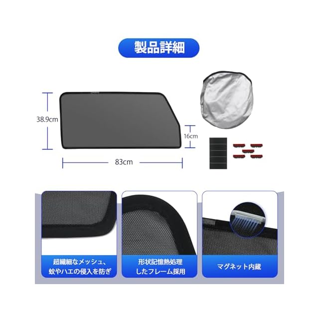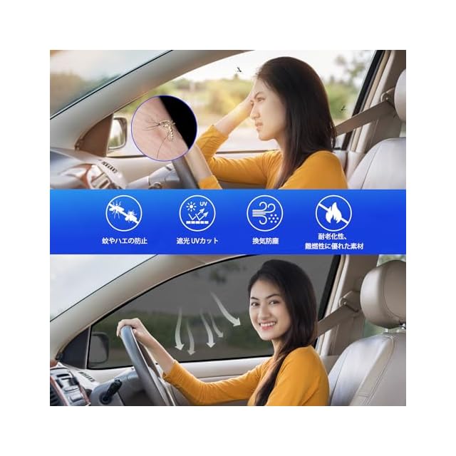 【遮光・通気・虫除け】太陽光をしっかりと遮断してくれます。素肌だけでなく、車の内装を日光による劣化から保護します。空気をよく通すメッシュ生地を採用しており、夏でも風を感じる快適な車内空間をつくり上げます。なお、全面保護で、蚊やハエの侵入を防ぎ、車中泊や仮眠時に大人も子供も害虫から守ってくれるので安心して休めます。
