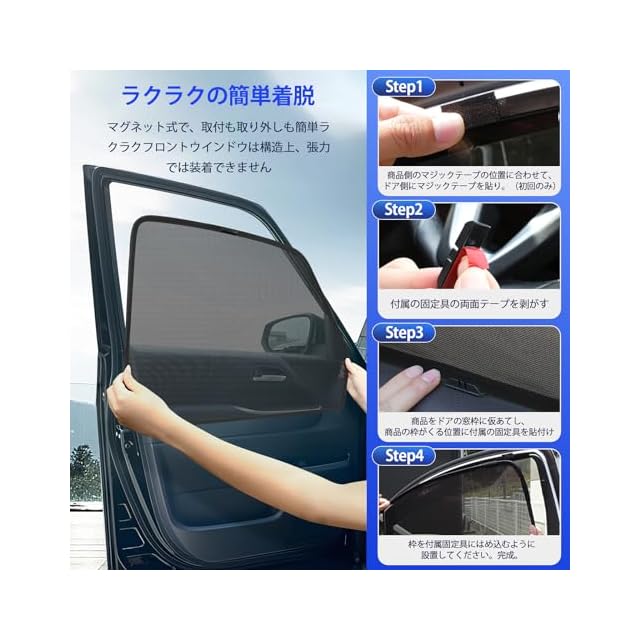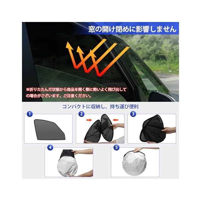 【マグネット式・窓の開閉が影響無し】取り付けはマグネット式でワンタッチ!女性も気軽に設置できます。磁石で付くのでドアを開けても基本落ちることもないです。使用しないと、数秒間で折りたたんで収納袋に入れてスッキリです。装着状態での窓の開閉が可能で、使いたい/使いたくないときはすぐに対応ができます。※視界確保のため運転席および助手席に装着したまま走行はできません。走行の際はお取り外しください。