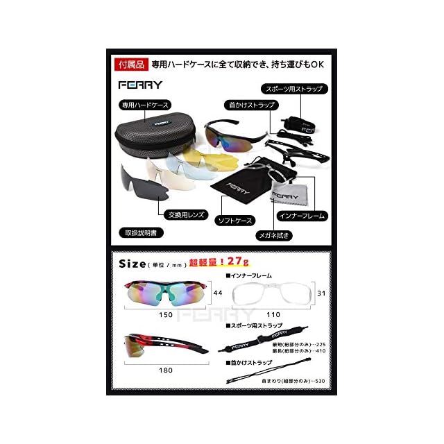 セット内容 ・スポーツサングラス本体 ・専用交換レンズ ・予備フレーム ・スポーツ用ストラップ ・脱着式インナーフレーム ・首かけストラップ ・専用ハードケース ・ソフトケース ・専用クロス ・取扱説明書