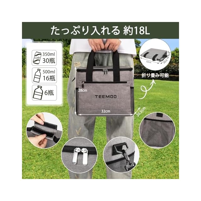 TEEMOO クーラーボックス 18L 保冷バッグ 大容量 折り畳み収納 クーラーバッグ 保冷力 最強 断熱 保冷 保温 防水 軽量 手持ち 肩掛け キャンプ 釣り 花火 BBQ レジャー 運動会 グレー | Trend Design BASE店
