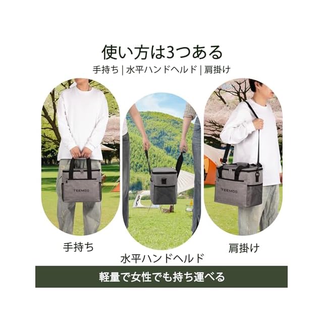 【大容量18L】TEEMOO クーラーボックスの外部サイズ:長さ32×幅さ20.5×高さ28cm ,手持ち、水平ハンドヘルド、肩掛けの3通りの使い方ができます。軽量なので女性でも持ち運びできます。注:18Lの上蓋にはメッシュポケットと底板はありません。33Lの上蓋にはメッシュポケットと底板はあります。