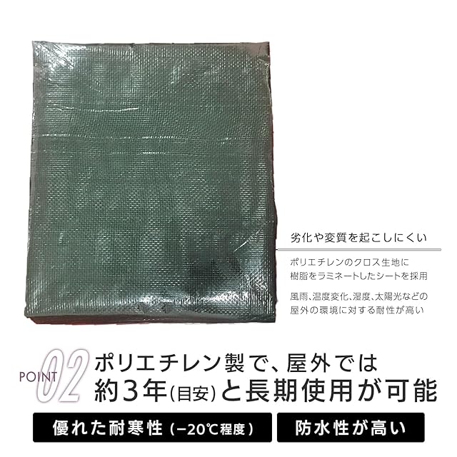 [仕様]#3000厚手、材質:ポリエチレン(本体)、ポリカーボネート(ハトメ)、ハトメ数16ヵ所、ハトメ間隔約90㎝。