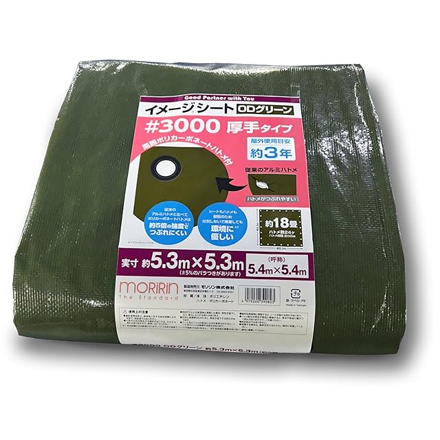 [仕様]#3000厚手、材質:ポリエチレン(本体)、ポリカーボネート(ハトメ)、ハトメ数36ヵ所、ハトメ間隔約90㎝。
