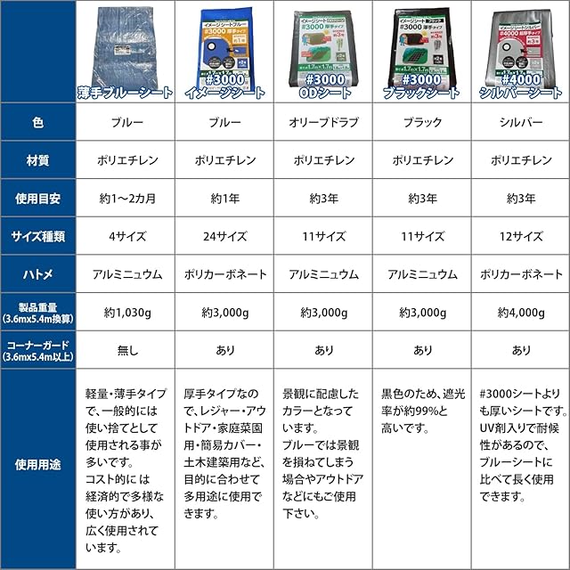 [仕様]#3000厚手、材質:ポリエチレン(本体)、ポリカーボネート(ハトメ)、ハトメ数12ヵ所、ハトメ間隔約90㎝。
