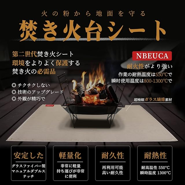 【耐火性がより強い】耐熱シート は直径がより細い8umガラス繊維採用し,難燃性と空気密度は普通の焚き火台シート高く、作業の耐熱温度は550℃で、瞬間使用温度は800-1300℃に達します。