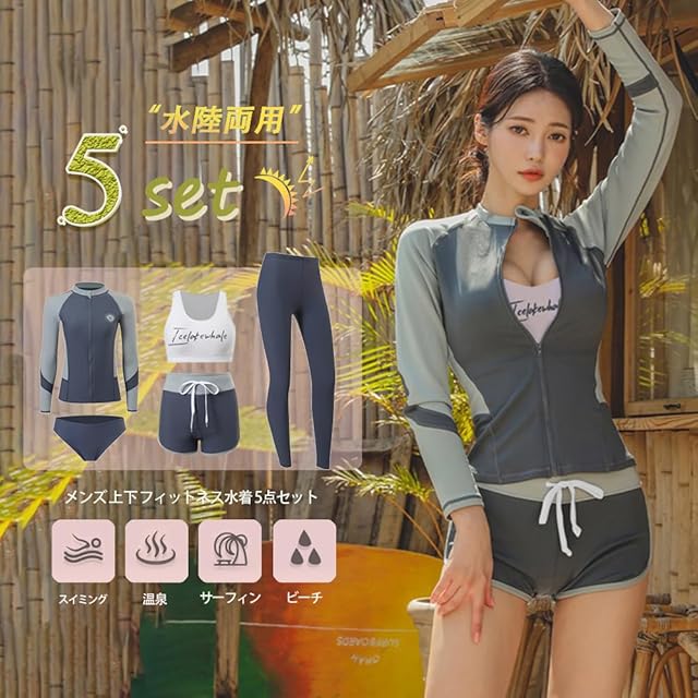 【素材構成&吸汗速乾】85%ポリエステル、15%スパンデックス。ソフトな肌触りの冷感素材を使用、良い着心地と抜群の耐久性。伸縮性に優れており、体形に合わせやすく、水中での動きも妨げないように体にフィットします。速乾性に優れた水着素材なので、海やプールだけでなくジムやヨガなど 、汗をかくシーンでの使用もOK、水陸両用で全アイテム着たまま水に入れます。軽量なのでとても動きやすく、最適の機能性、吸汗速乾通気のドライ繊維、激しい運動の後もさらっとした着心地!