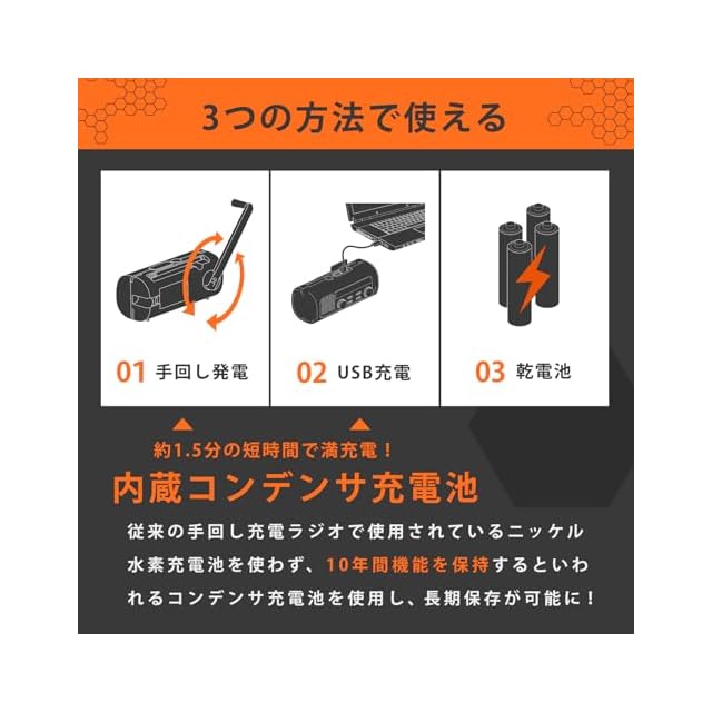【フライトレコーダーから採用した「目立つ」オレンジ色】航空機のフライトレコーダーは発見しやすい・視認しやすい色として、明るいオレンジ色または明るい黄色で作られています。当商品も防災グッズを入れたリュック内や、暗い場所でも視認しやすい本体色にすることで有事の際の「見つからない!」を解消できるよう、消防服や救難機などにも使われるオレンジ色を採用しました。【10年保管できる!次世代バッテリー】「内蔵コンデンサ充電池」を採用しており、10年間保管が可能!ニッケル水素やリチウム充電池と比べて長期保管に強く、長期保管後でも手回し充電をすれば使用可能です。長期間放置していても問題なく、災害用・防災用の備えに最適です。※スマホ充電には乾電池が必要となります。創業20年以上の日本メーカーである「dretec(ドリテック)」で品質管理を行っています。地震・津波・火事・事故などあらゆる災害が起こりうる今、お手持ちのラジオにバッテリー寿命が来ていないか見直してみませんか。