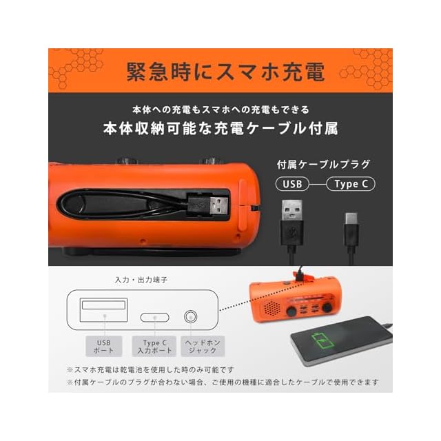 【スマホ充電可能】乾電池を入れれば、スマートフォンや携帯電話の充電器としても活躍し、緊急時にも安心です。充電用type-Cケーブルが付属しており、本体内に収納可能。紛失の心配を減らした設計になっています。(※Lightningケーブルは別途ご用意ください。)(※手回し充電、内蔵充電池からは出力が足りないためスマホ・携帯電話への充電はできません。)