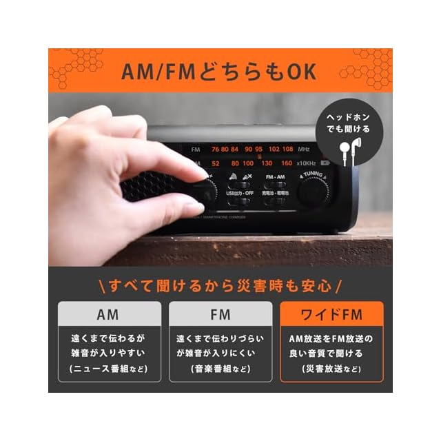 【AMラジオ・FMラジオ・ワイドFM対応】ワイドFMはAMを受信しにくい場所でも電波が届きやすく、防災情報などを聞くのに便利!イヤホンジャック付きで、有線イヤホンを別途備えておけば周囲への音漏れを気にせず聞くことができます。