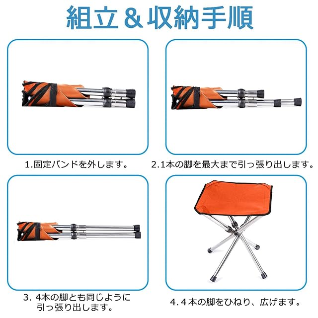 【瞬間組立・携帯便利】4脚伸縮イスの設置は脚を伸ばして広げるだけで簡単です。超軽量折りたたみいす、傘のような伸縮の構造なので一瞬で組み立て完了。組み立てやすい構造で、足を伸ばして広げるだけで簡単にセットできるため、子供や女性の方にでも楽にセットできます。収納時の長さは26センチだけで、リュックなどにも入ります。