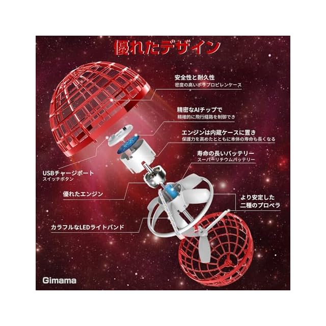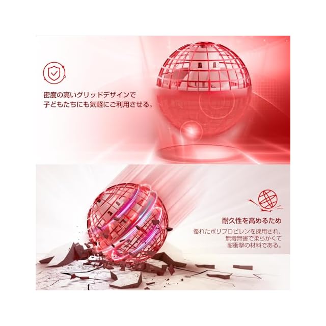 【優れた材料と独特なデザインの両立】耐久性を高めるため優れたポリプロピレンを採用され、無毒無害で柔らかくて耐衝撃材料である。軽く柔軟性のある作りなので落ちても壊れない。コントローラーを使用せず、赤外線で四方を感知して自動で飛んでくれるフライングボールであり、手を近づけたり、壁に近づいたら反対方向へ飛んでくれるので簡単に飛ばせて遊べる。中央のLEDが色を変えて点滅し綺麗で、夜に遊びるとアステロイドのような輝いているフライングボールは手中で回転する。
