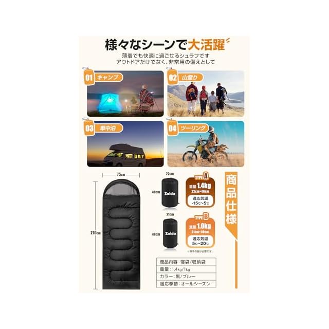 【オールシーズン対応・ゆったりサイズ感】約210*75cm 収納サイズ:約40×20cm 重量:1kg/1.4kg。1kgの場合、適応温度:最低使用温度:0℃ 快適使用温度:10℃-25℃(自身の暑さと寒さの感覚によって使用)。1.4kgの場合、最低使用温度-15℃で超保温。 夏用寝袋 と 冬用寝袋 を揃い、ほとんどのお客様のニーズを満たす、季節や用途により、選べ頂けます。また寝袋は封筒型で、内部に余分なスペースがあり、中で手足を伸ばしたり、楽に寝返りを打てますので、窮屈感が全くありません!
