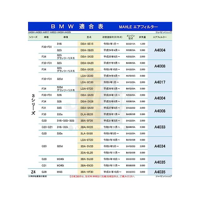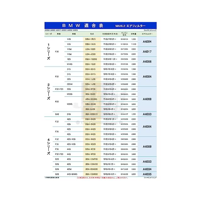 適合車種【3シリーズ (F30 F31 F34) 318i 320i 320iグランツーリスモ 328i 型式 DBA-3A20 DBA-3B20 DBA-3X20 DBA-3X28 DBA-8E15】【4シリーズ (F32 F36) 420i 428i 型式 DBA-4A20 DBA-3N20 DBA-4A28 DBA-3N28】