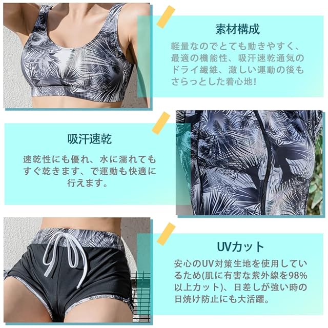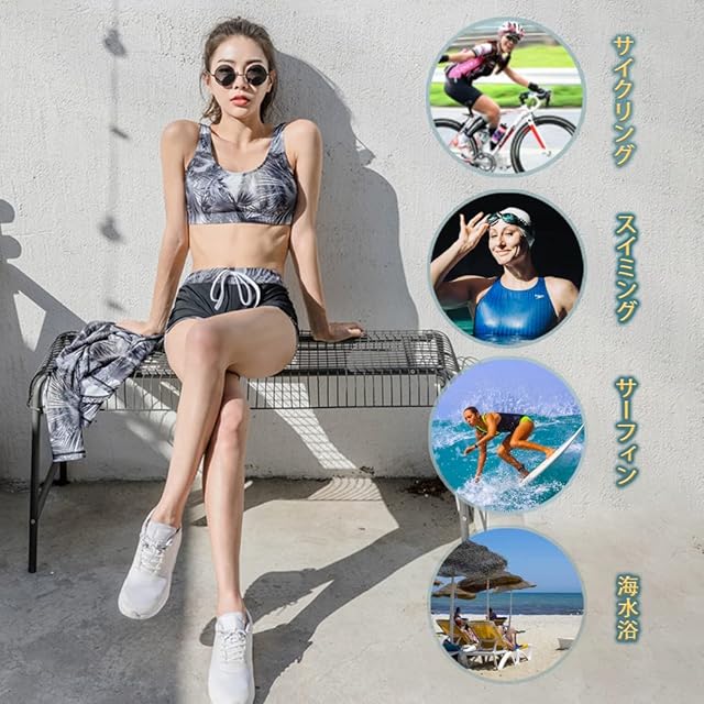【素材構成&吸汗速乾】85%ポリエステル、15%スパンデックス。ソフトな肌触りの冷感素材を使用、良い着心地と抜群の耐久性。伸縮性に優れており、体形に合わせやすく、水中での動きも妨げないように体にフィットします。速乾性に優れた水着素材なので、海やプールだけでなくジムやヨガなど 、汗をかくシーンでの使用もOK、水陸両用で全アイテム着たまま水に入れます。軽量なのでとても動きやすく、最適の機能性、吸汗速乾通気のドライ繊維、激しい運動の後もさらっとした着心地!