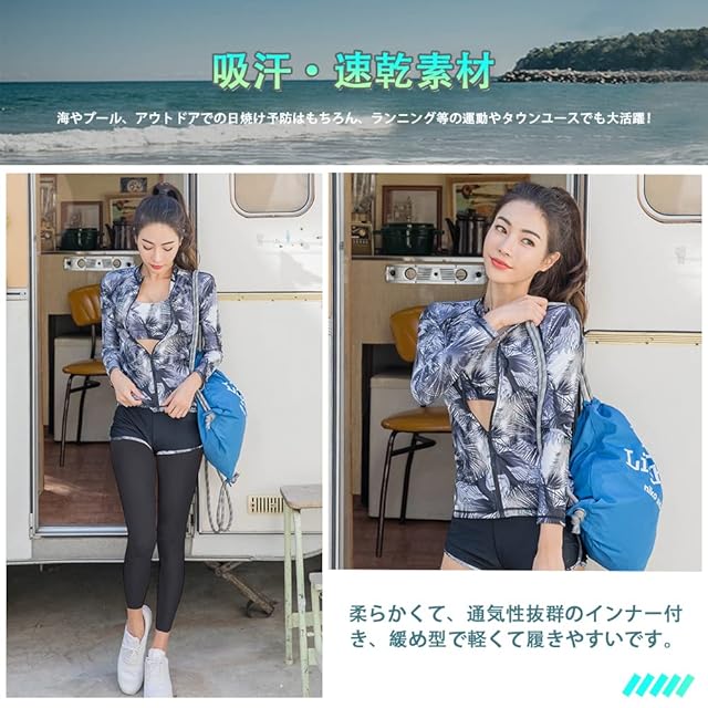 【適用場合&水陸両用】海辺のみならず、軽量なのに伸縮性抜群の生地でとても動きやすく、吸汗・速乾素材なので運動に最適です!夏場のウォータースポーツや野外活動の際、海、ジム、プールやビーチ、、温泉と幅広いジャンルで使える便利なスポーツ・アイテムです。通勤、通学、ランニング、ヨガなど、スポーツウェアとしてもご利用いただけます。水に濡れても快適に活動できる生地を使用。前開き対応のラッシュガードは着脱も簡単です、着替えに便利。