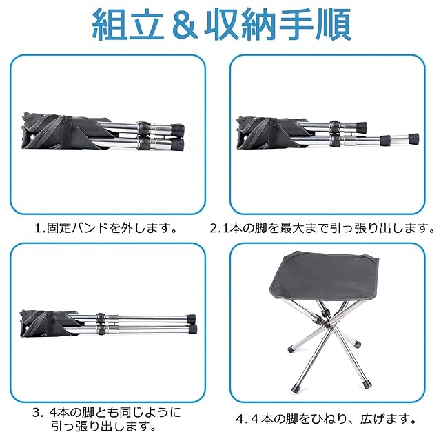 【瞬間組立・携帯便利】4脚伸縮イスの設置は脚を伸ばして広げるだけで簡単です。超軽量折りたたみいす、傘のような伸縮の構造なので一瞬で組み立て完了。組み立てやすい構造で、足を伸ばして広げるだけで簡単にセットできるため、子供や女性の方にでも楽にセットできます。収納時の長さは26センチだけで、リュックなどにも入ります。