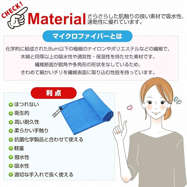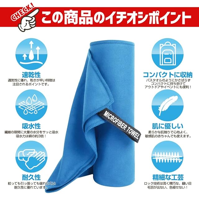 【超吸水・速乾・抗菌】見た目が薄くても吸水性に優れ、タオル専用のふわふわなマイクロファイバー繊維を使った吸水速乾タオル。極細繊維で肌触りもシルキーです。抜群の吸収力のうえ、軽くて肌触りも良く、耐久性も優れています。カビを防ぎ抗菌処理を施しました、汗を吸っても安心、濡らしたタオルに雑菌が繁殖するのも防いでくれます。