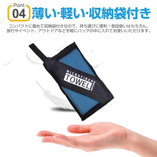 【コンパクトで軽量】薄い生地なので、折り畳み易く、簡単に収納袋に収まる。折り畳み時は、薄さは普通の綿タオルの1/4コンパクトなタオル。速乾タオルサイズ:40cm×80cm 付属品:収納袋