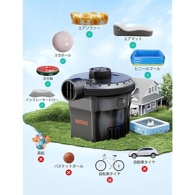 AstroAI 空気入れ プール AC電源/DC電源/充電式バッテリー給電 tiny pump 電動エアーポンプ タイニー ポンプ 空気抜き 両対応 3種類のノズル付き PSE認証済み 小型浮き輪 ゴムボート エアベット ビニール ブール適用 | Trend Design BASE店