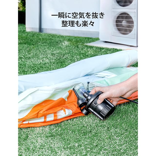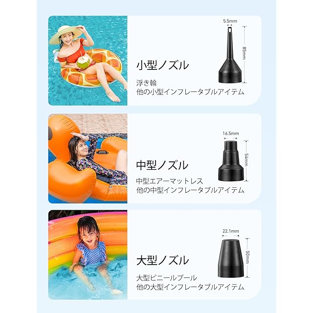 【三つの取り外し可能なノズル】:3種類の実用的なノズルは普段の物には空気を入れることできます。浮き輪、大型エアベッド等の物には高効率に充填できます。本エアポンプであれば安心そして楽しい夏を過ごしましょう。